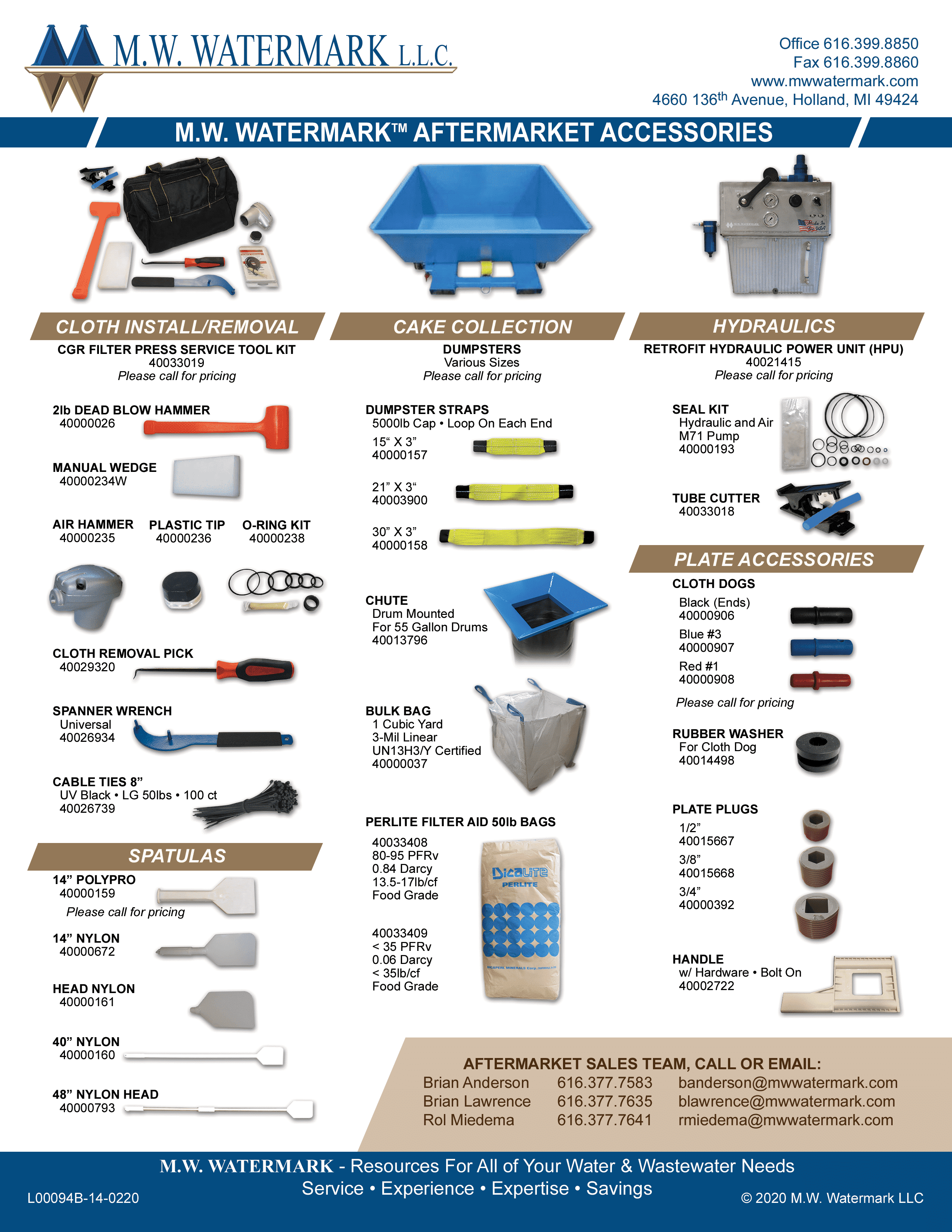 We also offer parts for filter plates, including plate handles, plate plugs, cloth dog pegs and caps, and plate shifters. For these parts and other installation and maintenance tools such as gasketing materials, O-rings, dead blow hammers, wedges, handles, air hammers, plate and cloth installation tools or bulk bags, download our Aftermarket Accessories Sheet.