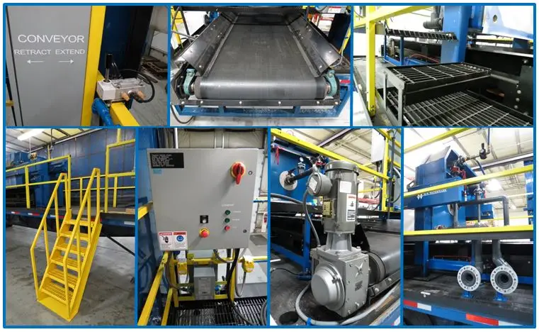 Filter cloths are included based on customer specification. The manifold design is air blowdown / even-fill and is constructed of stainless steel. The trailer itself includes several helpful features, including flexible side curtains, air ride suspension, independently adjustable trailer levelers, stainless steel cake chute, extendable slider belt conveyor, walkways / railings / stairs, electrical control panel, water wash-down deck and mounted LED overhead lighting.